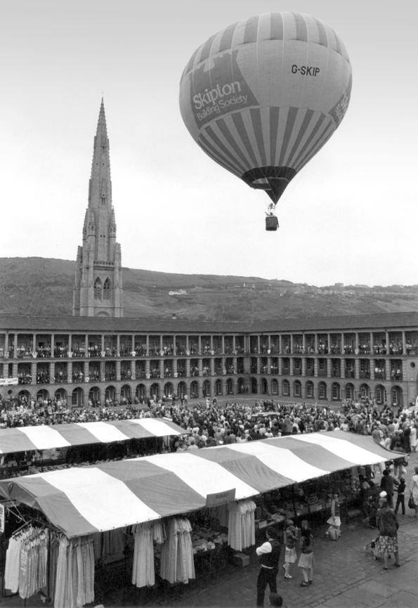 As the industrial revolution gained pace, ways of manufacture and trade changed significantly. The old cottage industries died out, and the need for the central market halls died with them. As the nineteenth-century moved on, use of The Piece Hall became much more varied. In 1824, with hot air balloons still a novelty, The Piece Hall was packed with people eager to witness man’s first foray into space. The ‘intrepid aeronaut’ was Charles Green – he had made his first ascent in 1821 and would go on to complete 500 flights. At a little after 4.30pm Green’s balloon rose into the air, and to the delight of the ‘immense crowd’ of onlookers, remained visible from The Piece Hall for fifteen minutes.